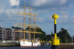 eventship at the mouth of the river Lesum in Bremens northest quarter, Vegesack. The fully-rigged ship (three-masted,